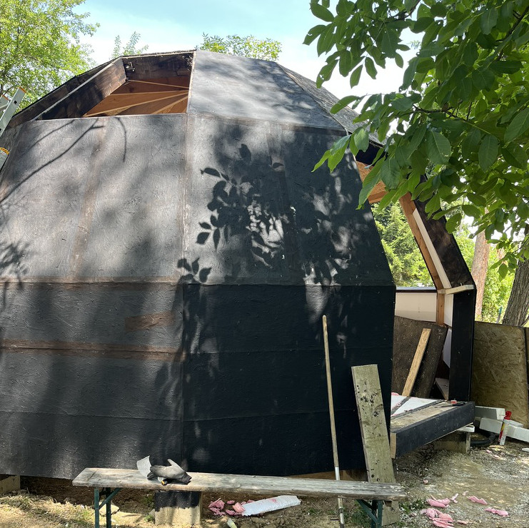 2024. tavaszán nekiálltunk felépíteni két faváz szerkezetű geodómot, amiből az egyik a Gyöngyház nevet kapta (a tervezett végső külső borítása gyöngyház hatású), a másik pedig a sárga külsejű Napkupola.